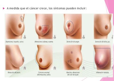 Dolor o molestia en la mama, que persiste después del ciclo mestrual, retracción de la piel o pezón, cambios de coloración en la piel, palpación de bultos dentro de la mama, color o bultos en la axila, secreción de cualquier línquido por el pezón.